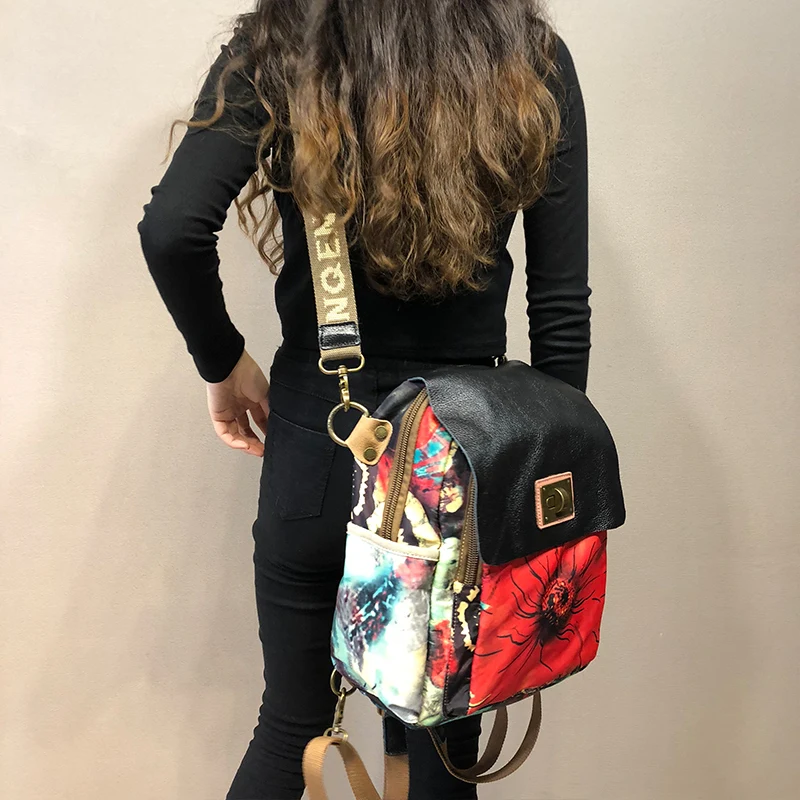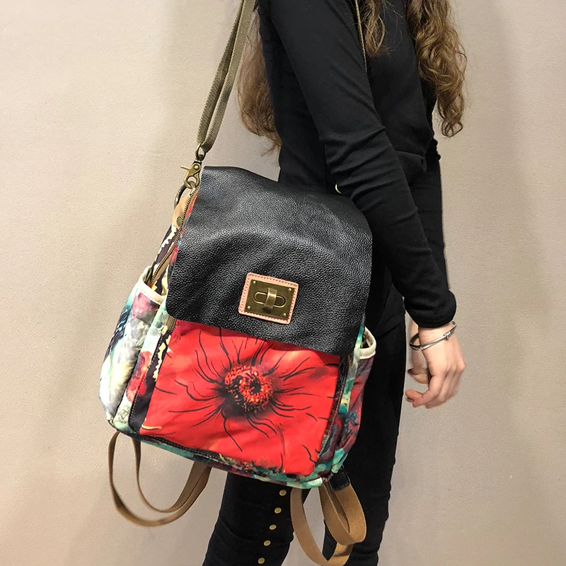 2020 New vintage leather Women backpack laptop bag female printed flowers travel backpacks Canvas w