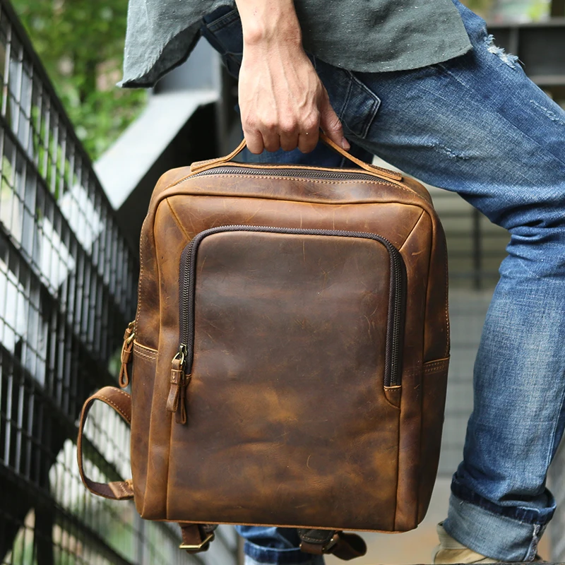 Review Top Crazy horse leather retro Men backpack computer bag men's first layer cowhide large capacity simple