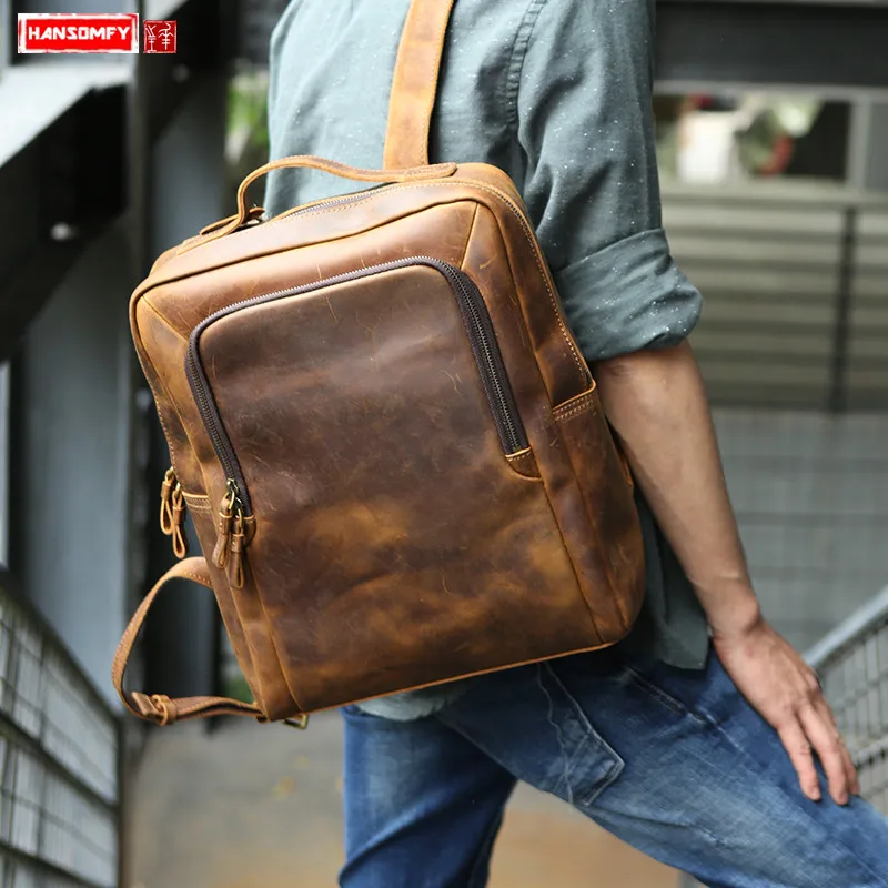 Crazy horse leather retro Men backpack computer bag men's first layer cowhide large capacity simple