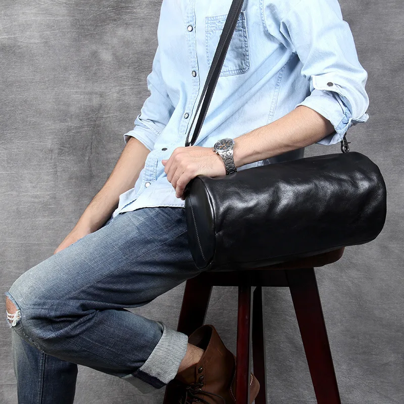 New Black leather men's shoulder bag retro Soft rub color men's bag top layer leather cylinder bag
